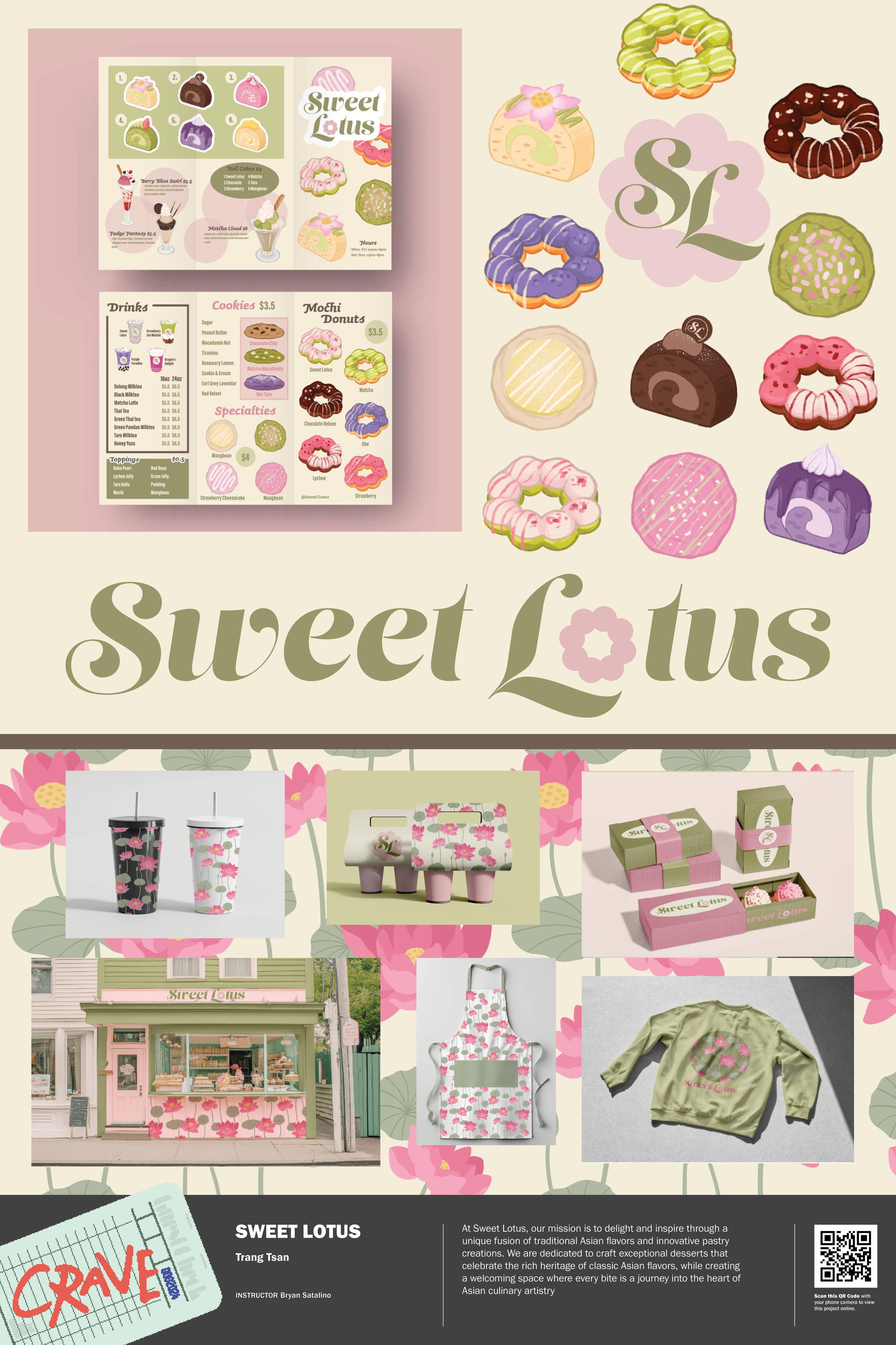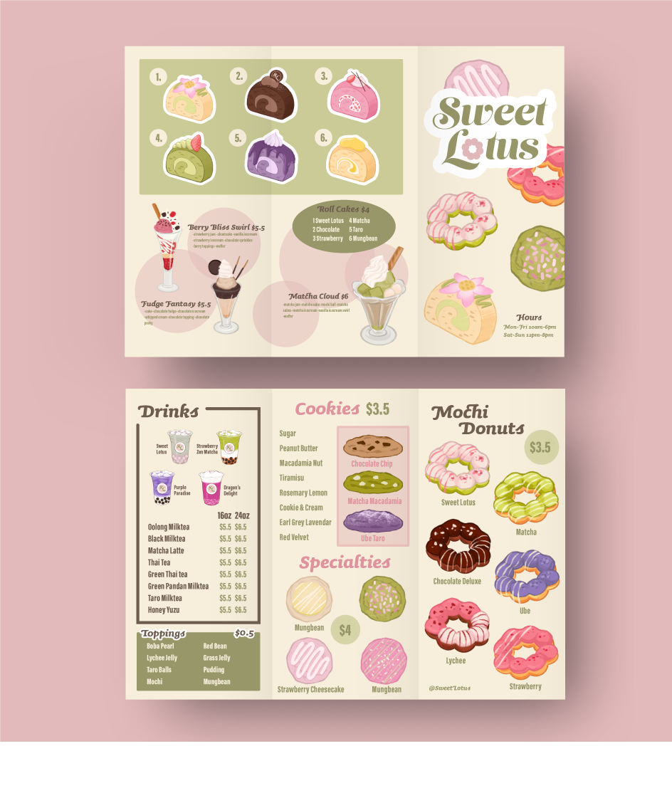 This project explores the creation of an Asian-inspired café that blends traditional Asian flavors with modern pastries. I chose the lotus flower as the main visual motif because of its cultural significance and personal connection to my Vietnamese heritage. The soft pink and green tones of the lotus guided the color palette, shaping a brand identity that feels light, cheerful, and approachable. The result is a cutesy, inviting brand that celebrates warmth, culture, and joy.